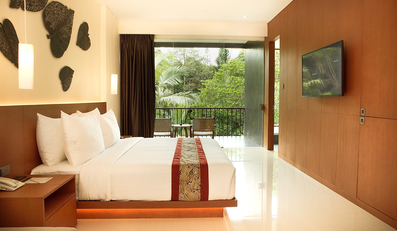 Suite Room at SanGria Resort & Spa is a lavish retreat designed for ultimate comfort and relaxation. Featuring a king-size bed and a modern tropical room design, this suite offers a sophisticated ambiance. Large glass rolling doors lead to a spacious balcony, providing breathtaking views of the meticulously landscaped gardens. Additionally, the Suite Room includes a cozy living room area, perfect for unwinding or entertaining. Complete with a private jacuzzi and a convenient coffee machine, the Suite Room ensures that every moment is a pleasure, combining luxury and convenience for an unforgettable stay.